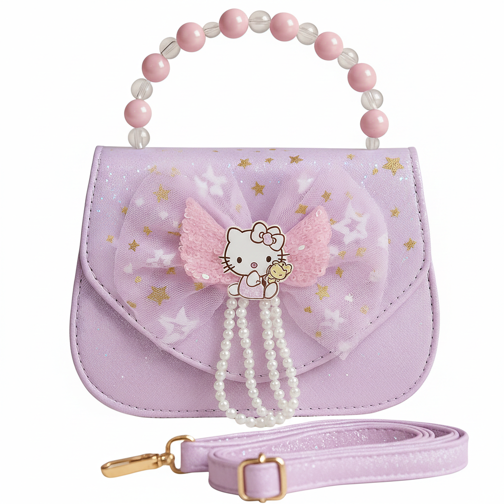 Add a touch of magic to any outfit with this enchanting Hello Kitty mini handbag. Designed with a shimmering glitter finish and adorned with a whimsical tulle bow, this accessory is perfect for young fashionistas who love a bit of "kawaii" flair. Whether carried by the elegant beaded handle or worn as a crossbody, it’s a delightful statement piece for parties, playdates, or daily adventures.