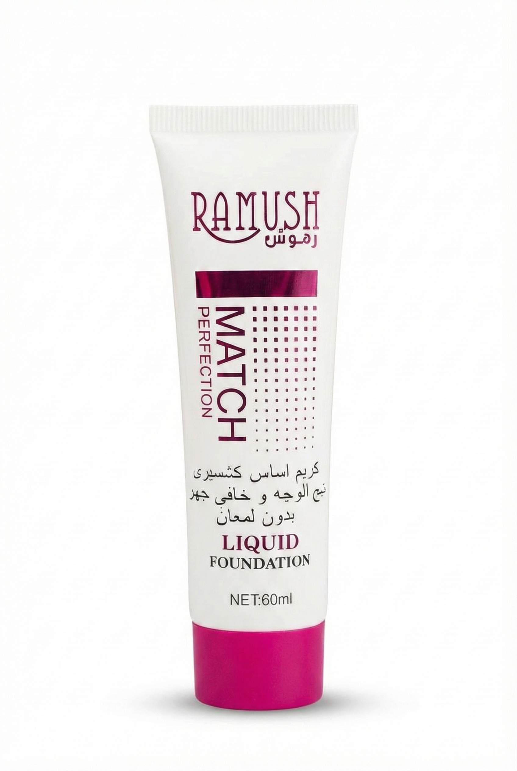 This is a 60ml tube of Ramush Match Perfection Liquid Foundation. It is a "Kashmiri" style foundation, designed to provide face coverage and act as a concealer, with a matte (no-shine) finish.