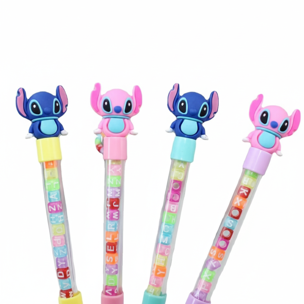 Add a burst of color and personality to your stationery collection with this charming Stitch and Angel pen set. These aren't just pens—they are a creative activity in one package. Each pen features a clear barrel packed with vibrant alphabet beads and is topped with a soft, silicone character figure.