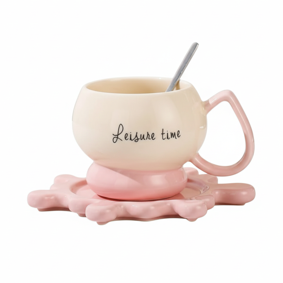 Enjoy a bright start to your morning or a cozy afternoon break with this whimsical ceramic tea and coffee set. Featuring a distinctive "bubbled" silhouette and a playful sun-shaped saucer, this set is designed to bring a touch of cheerful modern art to your tabletop. The soft pastel tones and elegant "Leisure time" script make it a perfect companion for your favorite brew and a side of biscuits.