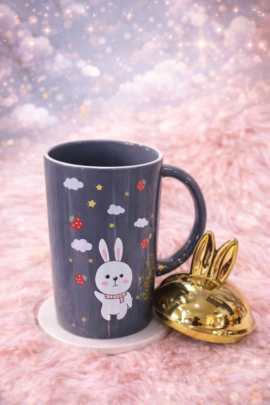 Whimsical "Cute Rabbit" Ceramic Mug with Golden Bunny Ear Lid